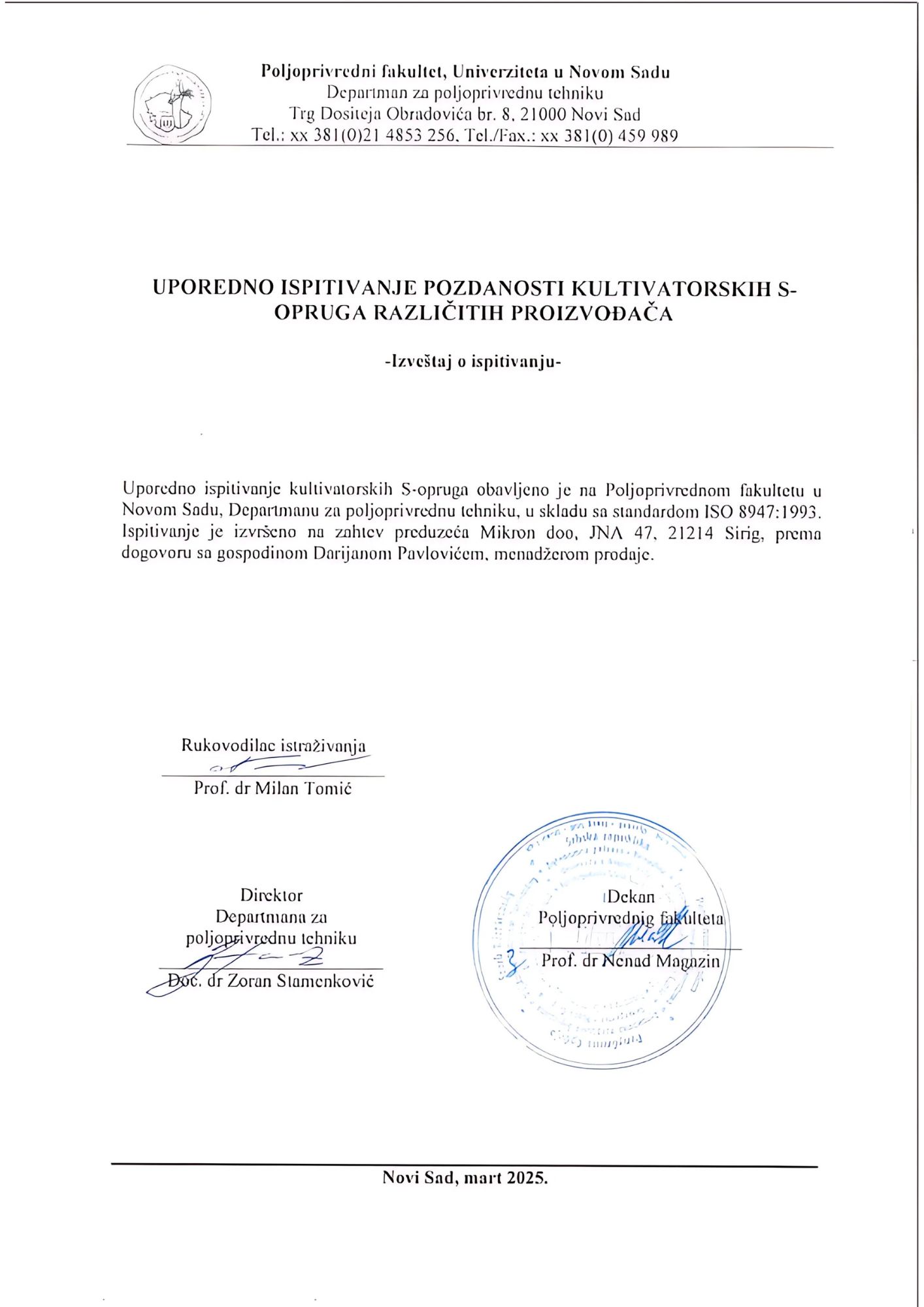 Tim kompanije Mikron, u saradnji sa Departmanom za poljoprivrednu tehniku Poljoprivrednog fakulteta u Novom Sadu, sproveo je detaljno testiranje S opruga različitih proizvođača prema standardu ISO 8497:1993, uz povećano opterećenje od 1200 N + 20 mm predopterećenja (u odnosu na standardnih 1000 N), na zahtev tima iz Mikrona.